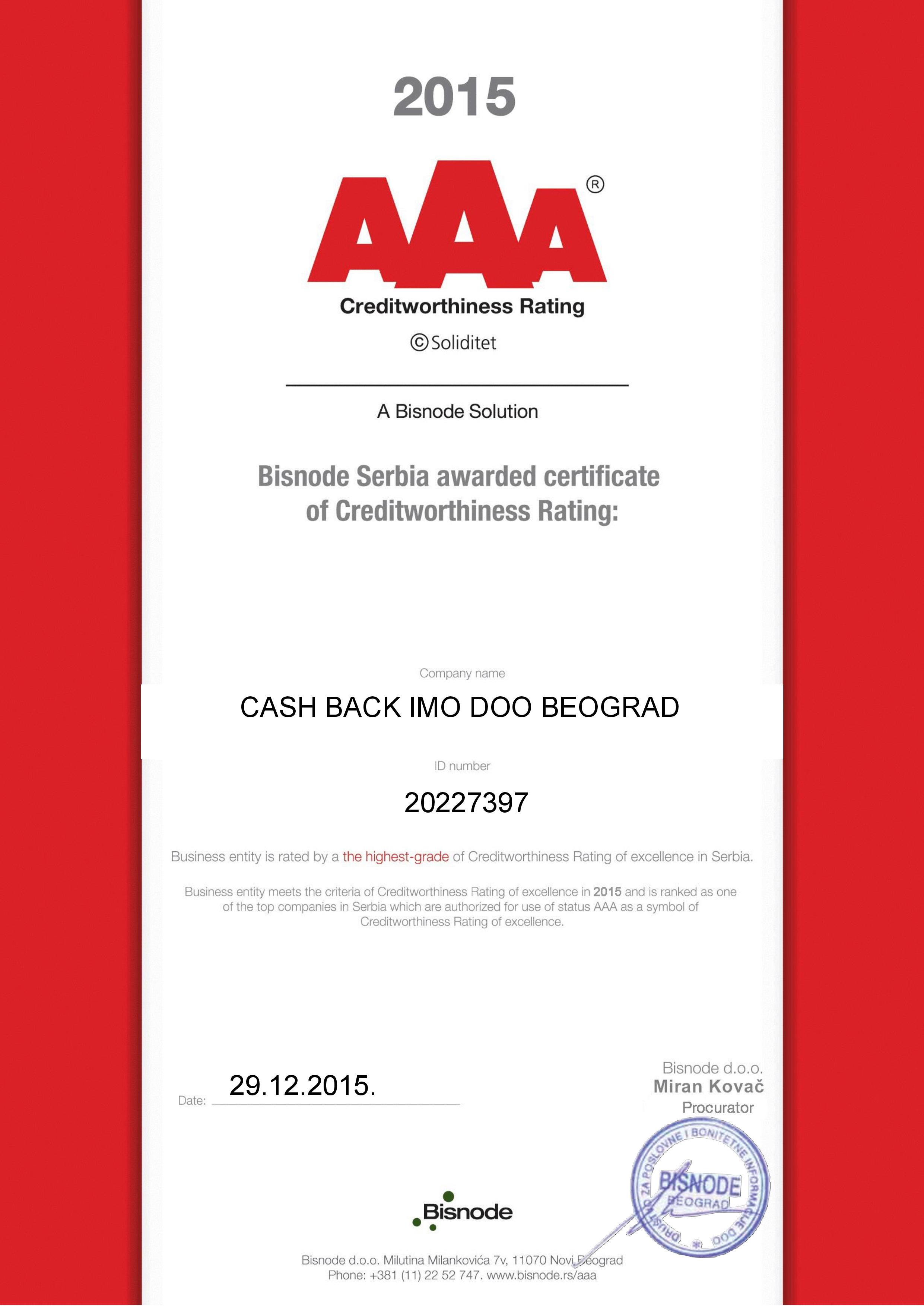The Cash Back network covering the Belgrade office has the international IVA certificate which is the highest European international standard in this field.